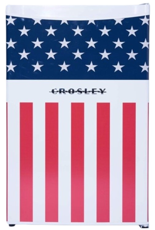 Crosley® American Tribute Series 4.4 Cu. Ft. White Compact Refrigerator features sliding bulk storage bin, adjustable temperature control, and stylized American Flag graphic on door.Read More